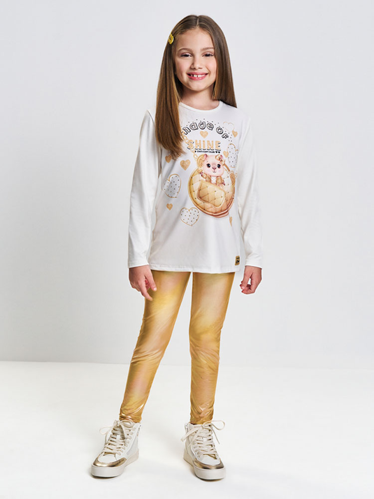 "Este deslumbrante conjunto infantil feminino da coleção Inverno 2026 é a escolha ideal para as pequenas que amam brilhar com muito estilo e conforto. A blusa, confeccionada em cotton macio, apresenta uma estampa frontal lúdica e sofisticada de uma charmosa capivara com acessórios, enriquecida com o brilho delicado do strass. O grande destaque do look é a calça legging em malha fóil (lamê prisma), que possui um efeito metalizado incrível, garantindo um visual moderno e fashionista. Pensado para oferecer bem-estar sem abrir mão da elegância, o conjunto conta com acabamentos premium, como o decote em friso, cós com elástico rebatido para um ajuste perfeito e uma exclusiva etiqueta emborrachada dourada que adiciona um toque final de luxo à peça. Este conjunto é a opção perfeita para ocasiões especiais, festas de aniversário ou passeios onde o brilho é o protagonista. Para um visual completo e cheio de atitude, combine com botas ou tênis metalizados e, em dias mais gelados, uma jaqueta de couro fake ou um casaco de pelinhos elevará ainda mais a produção."