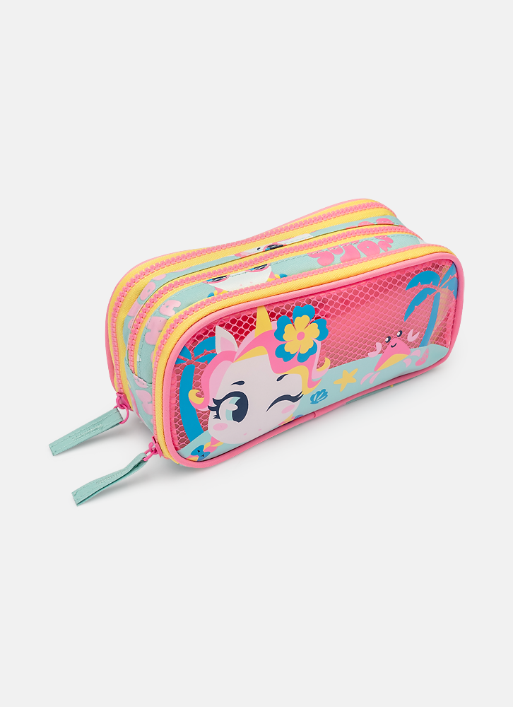 Estojo em nylon com 3 compartimentos. Parte frontal em PVC transparente com estampa de unicórnio. Tamanho: Único Medidas: 21 cm x 10 cm x 7 cm (LxAxP) Cor: Verde Água Indicado para: Crianças / adolescentes / adultos Ocasião: Escolar / trabalho Material externo/interno: Poliéster (nylon) Material diferenciado: PVC transparente Fechamento: Com zíper Capacidade: 800 ml Peso do produto: 80g Compartimentos: 3 compartimentos Limpeza e conservação: Para limpeza, utilize apenas pano umedecido com água morna e sabão neutro; nunca utilize produtos abrasivos, solventes ou quaisquer agentes químicos; evite contato com água do mar, areia e outros abrasivos; para secar utilize um pano seco e macio. Resistente à água.